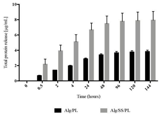 Protein release analysis. Release of total proteins from Alg/PL and Alg/SS/PL biomembranes at different time incubation in physiological solution at 37 °C and 5% CO2. The total protein content was determined with Pierce™ BCA Protein Assay Kit (Thermo Fisher Scientific, Waltham, MA, USA) in the incubation media collected at different times. The experiments were performed in triplicate on three different batches of biomembranes.