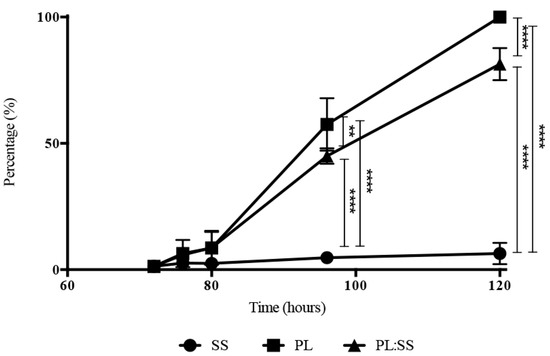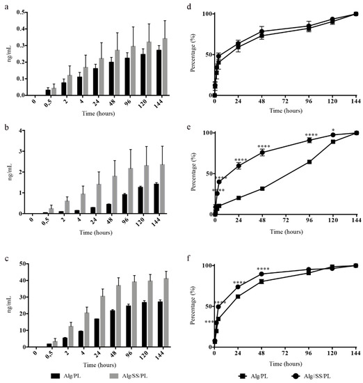 The histogram in Figure 2 shows the release of total proteins following the incubation of Alg/PL and Alg/SS/PL biomembranes with physiological solution, at 37 °C and 5% CO2 and for different time points. The release from the two biomembranes presented the same trend, but a higher amount of released protein was evident in the incubation medium of Alg/SS/PL biomembrane. This was due to the co-presence of SS protein and PL proteins which are instead present in equal amounts in both types of biomembranes (50% w/w). By ELISA assay was evaluated the release in the incubation medium of PDGF-BB, VEGF, and TGF-β1 (Figure 3a–c), to monitor the PL growth factors release in time. Interestingly, the presence of SS in the biomembrane determined the release of a higher amount of growth factors. To investigate possible differences in the release of these growth factors in time, the percentage of factors released in the incubation medium was determined from 30 min to 6 days: 100% was considered the growth factor amount released after 6 days, intended as the maximum capability of the sponge to release a specific growth factor (Figure 3d–f). In the presence or absence of SS in the biomembrane, the growth factors analyzed were released more than 50% of the total within the first 24 h. Only for PDGF-BB, in absence of SS, we can observe a delayed release (Figure 3e) without the initial burst of release like registered for the other analyzed factors. For PDGF-BB, a statistically significant difference in the release was observed from 2 to 120 h, while the release trend of TGF-β1 was similar from both types of biomembranes and a statistically significant difference in the percentage of growth factor released was observed only from 2 to 48 h (Figure 3f). No statistically significant differences were observed for VEGF release (Figure 3d).