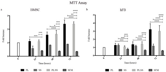 Cell viability with biomembrane components. Analysis of bone marrow mesenchymal stromal cells (BMSC) (a) and human skin fibroblasts (hFB) (b) viability and capacity of cells to proliferate following the PL stimulation in the presence of SS. Cells were maintained up to 72 h in Serum-free medium (SFM), or SFM supplemented with PL (PL), Sericin (SS), PL and Sericin (PL:SS). Cell viability was determined by a Thiazolyl blue staining (MTT assay), **** p < 0.0001, *** p < 0.001, ** p < 0.01, * p < 0.05.