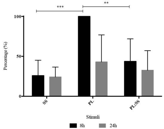 These apparently conflicting results with the literature data [48,49] may be attributed to the different protocol of treatment of the cells. In fact, while these authors performed a SS pre-treatment before inducing the oxidative insult, we simulated what occurs within the lesion, and then the contemporaneity of the oxidative stress and the treatment with SS and PL was evaluated.
