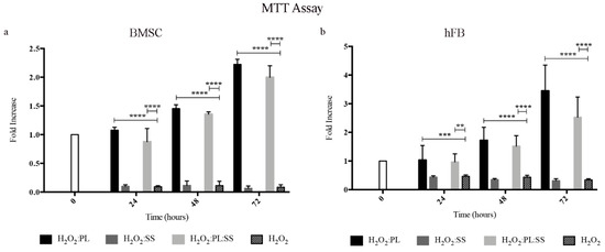 Protection against oxidative stress. Viability of BMSC (panel a) and hFB (panel b) after an oxidative stress induced by H2O2 (1 mM) and the effect of a contemporary treatment with Sericin (SS), Platelet Lysate (PL), and PL:SS. Cell viability was determined by MTT assay, **** p < 0.0001, *** p < 0.001, ** p < 0.01.
