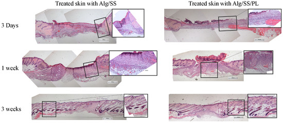 To evaluate the effect of the biomembranes in vivo, we used a mouse excisional wound healing model in C57/BL6 mice. Two full-thickness skin lesions were created in the back of the animals and a biomembrane was applied to each lesion. On each animal, we applied two biomembranes: one without PL as control and one with PL as treatment. We used different combination of sponges: Alg, Alg/SS, Alg/PL and Alg/SS/PL. Evaluation of the biomembrane efficacy was determined by the histological analysis of the samples recovered from the animals at different times from the treatment (2, 3, 7, 14 and 21 days). In Figure 8 we compared the healing of the lesions treated with the Alg/SS/PL and Alg/SS biomembranes. The hematoxylin-eosin staining showed the closure of the lesion after 3 weeks in both the lesions treated with Alg/SS/PL or Alg/SS. However, a more organized tissue similar to a healthy skin was observed in the treated animal group. At 3 days an inflammatory response was evident, which was completely substituted by a granulation tissue at 1 week. The histological analysis included also the evaluation of some specific parameters suggested by Abramov et al. [24]: (1) inflammation, defined in an initial (early) phase by the presence of neutrophils and in a more advanced (late) phase by the presence of plasma-cells and monocytes; (2) granulation tissue, intended as amount and maturation of granulation tissue present. The degree of maturation of the granulation tissue was determined by the shape and the alignment of the fibroblasts; (3) collagen deposition, considering the amount and the degree of maturation of the collagen fibers; (4) re-epithelialization, considering the degree of closure of the lesion; 5) neo-vascularization, considering the number of formed vessels.