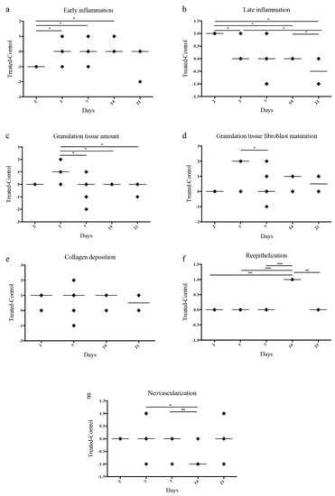 Quantification of histological parameters. Histology of the lesions treated with Alg/SS and Alg/SS/PL biomembranes; evaluation and statistical analyses of specific parameters suggested by Abramov et al. [24]: inflammation, defined in an early phase (a) and a late one (b); granulation tissue, intended as amount (c) and maturation of granulation tissue (d); collagen deposition (e); re-epithelialization (f) and neo-vascularization (g). All evaluations were reported in the plot as difference between the PL treated and the control lesions, *** p < 0.001, ** p < 0.01, * p < 0.05.