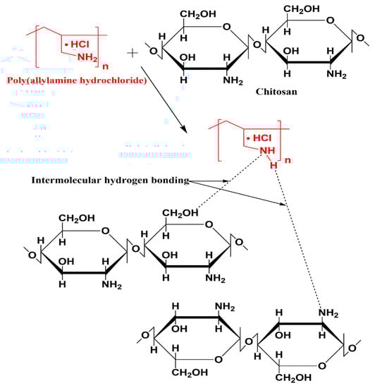 Poly(allylamine hydrochloride) is a water-soluble weak-base, a cationic and biodegradable polymer. It has a large number of amino groups that are present as a free amine or cationic ammonium salt like other amine group-containing polymers [21,22,23]. Chitosan alone cannot satisfy biomedical applications due to mechanical defects; therefore, blends of chitosan are employed to overcome insufficient mechanical features [24,25,26,27,28]. Multitudinous systems comprising of polymeric materials have been prepared to serve as drug carriers to investigate the controlled release behavior of payloads and offer smart drug delivery. Polymeric biocompatible materials such as polyelectrolytes nanoparticles coated with a bilayer of polyelectrolytes, namely PAH and poly (sodium 4-styerenesulfonate) (PSS) were investigated for hydrophobic drug release [29]. It has been reported that PAH and polyurethane multilayer films as a drug delivery system are potential contestants for pharmaceutical and biomedical applications [22]. The efficiency of nanoparticulate drug delivery systems can be increased by modifying poly(d,l-lactide-co-glycolide) via layer-by-layer adsorption, with two polyelectrolyte pairs such as PAH/PSS and poly(l-lysine hydrobromide)/dextran sulfate [30].
