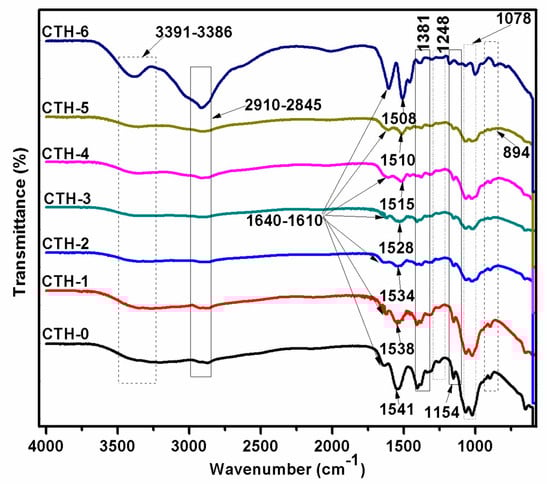 FTIR spectroscopy is a technique frequently employed to uncover intermolecular interactions, particularly hydrogen bonding between diverse types of functional groups in polymeric molecules. Intermolecular interactions either lead to a shift in frequency or band broadening of particular functional groups. Information related to the conformational changes occurring in compatible blends can be acquired by FTIR spectral analysis [65]. As we had prepared several solutions—CTH-0 (100/0), CTH-1 (90/10), CTH-2 (80/20), CTH-3 (70/30), CTH-4 (60/40), and CTH-5 (40/60)—of CS/PAH in different ratios, we investigated whether CS molecules really interacted with the polymeric backbone of PAH. To confirm possible interactions, the prepared biodegradable blend films—chitosan and PAH samples—were subjected to ATR-FTIR spectroscopy. The presence of each component was established by the appearance of absorption bands for different functional groups. The spectra of CS, PAH, and their blend films are shown in Figure 2. In the case of PAH spectra, the bands at 1610 cm−1 and 1381 cm−1 were detected corresponding to N–H in the plane bending motion and C–H bending, respectively [66]. The broadband varying from 3400 to 2800 cm−1 with two split peaks was observed—one peak at 2910 cm−1 and 2845 cm−1, attributed to C–H asymmetric and symmetric vibrations—while another sharp peak at 3391 cm−1 was caused by stretching vibration of the intermolecular as well as intramolecular N–H bond of the primary amine group. These peaks were observed in all blend films, but with less intensity [21].