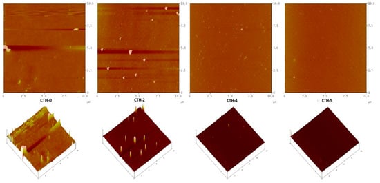 AFM is an excellent tool that investigates the texture and morphology of diverse surfaces, including thin films [70,71,72]. The versatility of AFM allows acquiring of rigorous observations and assessment of the textural and morphological characteristics of films. In this study, the surface texture and roughness of CS and its blend films with PAH (CTH-0, CTH-1, CTH-2, CTH-3, CTH-4, CTH-5) were examined using AFM with a Nanoscope IIIa Multimode microscope (Veeco Instruments, Inc., Santa Barbara, CA, USA), equipped with a silicon RTESP7 cantilever (Veeco Nanoprobe, Camarillo, CA, USA) in tapping mode. For the silicon tip, nominal spring constant of 40 N/m was applied. AFM images were recorded as 10 μm × 10 μm using scan rate of 0.5 Hz under atmospheric conditions at ambient temperature. For AFM measurements, the blended solutions of polymers were spin-coated on a newly cleaved mica surface using a spin coater (Laurell Technologies Corporation, USA) and the spinning rate was maintained at 1500 RPM for 2 min. Experimental data were processed with the help of Nanoscope 5.30 software [13]. The micrographs infer that films coded with CTH-0 and CTH-2 were found to be rough. On the other hand, CTH-4 and CTH-5 films displayed a smooth surface morphology (Figure 3). This might be attributed to the rigid and crystalline nature of chitosan [73]. These properties of chitosan molecules were also affected by sample preparation. Like these films, CTH-0 and CTH-2 present spherical, branch crystals due to the higher percentage of chitosan 100% (w/w) and 80% (w/w), respectively [69]. AFM analysis showed that as the concentration of PAH increased up to 60% (w/w), the surface morphology improved, representing an increase in compatibility with polymer chains. The CTH-5 film was found to be more homogenous as compared to the other films.