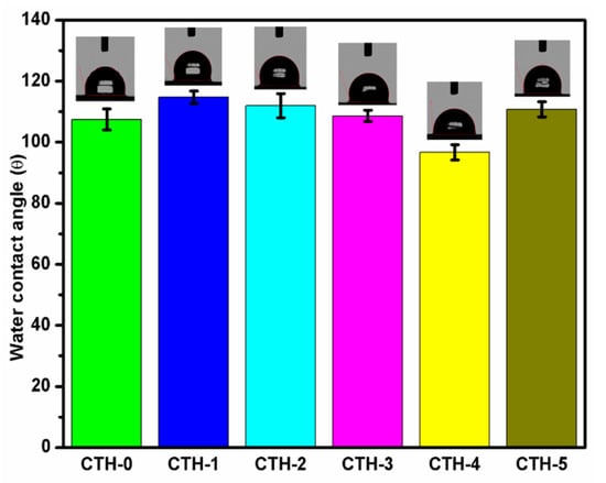 Water contact angle measurement is one of the most common methodologies used to determine the wettability of a surface/material and their hydrophobic or hydrophilic nature [74]. The intrinsic values of WCA are dependent on surface roughness, porosity, and heterogeneity [75]. We recorded WCA of different images for each blend film using video contact angle instrument VCA optima (AST Products, Inc. Billerica, MA, USA) until WCA became constant. An automatic WCA measurement, from both the right and left-hand side of the drop, was done by VCA-optima software. On average, twenty measurements were performed per film, which was cut from four different sites. A report demonstrated that the water contact angle of blank chitosan was higher than 83° due to its hydrophilic nature and high surface tension [76]. In order to decrease the hydrophilicity of chitosan, it was blended with PAH to impart flexibility. The WCA of the prepared films fluctuated between 96.7° to 114.7° because of a CS-to-PAH ratio that varied as shown in Figure 4. As shown in Table 2, the WCA of CTH-0, CTH-1, CTH-2, CTH-3, CTH-4, and CTH-5 was 107 ± 3.5°, 114.7 ± 2.0°, 112 ± 3.9°, 108.6 ± 1.8°, 96.7 ± 2.5°, and 110.8 ± 2.5°, respectively. It was noted that as the concentration of PAH in blend films increased up to 60% (w/w), except 40% (w/w), the WCA increased. This increase might be due to a decrease in intensity of polar groups, resulting in more networking among polymer chains [9].