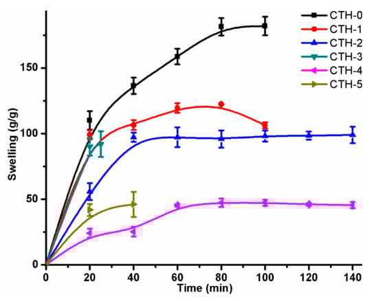The swelling behaviour of pristine CS and CSPAH blend films was studied as a function of time (Table 3). It was observed that all films displayed a linear increase with time and equilibrium for the CTH-1, CTH-2, and CTH-4 films were attained at around 80 min, 60 min, and 80 min, respectively. The CTH-3 and CTH-5 films exhibited a distinctive behaviour as these films were converted into a gel-like material after 25 min and 40 min, respectively. The CTH-1 film had a higher degree of swelling response—around 122 g/g after 80 min—as compared to the other blend films, but less than blank chitosan film, which was around 182 g/g (Figure 5).