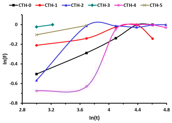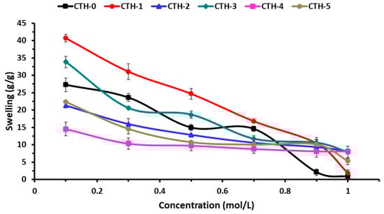 The swelling behaviour of pure CS and CS/PAH blend films as a function of time was evaluated in different ionic solutions, such as NaCl and CaCl2. The effect of the ionic concentration of electrolytes on the swelling behavior of blend films is shown in Figure 7 and Figure 8. These Figures demonstrate that with the increase of concentration of electrolyte in swelling medium, the swelling capacity of blend films significantly decreased. It was found that the nature of salt and the concentration of ions had a noticeable influence on the swelling response. As the concentration of both electrolytes (NaCl and CaCl2) increased, the rate of swelling decreased (Table 5 and Table 6). This might be due to the generation of high-charge screening effects, which ultimately reduced the rate of diffusion and osmotic pressure developed between the films and the external solvent. Consequently, the diffusion of solvent into blend film decreased, resulting in lesser swelling. From Figure 7 and Figure 8, it can be inferred that maximum swelling was shown by CTH-1 in NaCl (0.1 M) compared to CaCl2 (0.1 M). The swelling value for CTH-1 was 41 g/g and 26 g/g in NaCl (0.1 M) and CaCl2 (0.1 M), respectively [77]. Furthermore, overall higher swelling response was noticed in NaCl solution, as compared to other CaCl2 solutions. It was observed that the CTH-3 film was converted into gel-like material in 0.1 M and 0.3 M CaCl2 solutions.