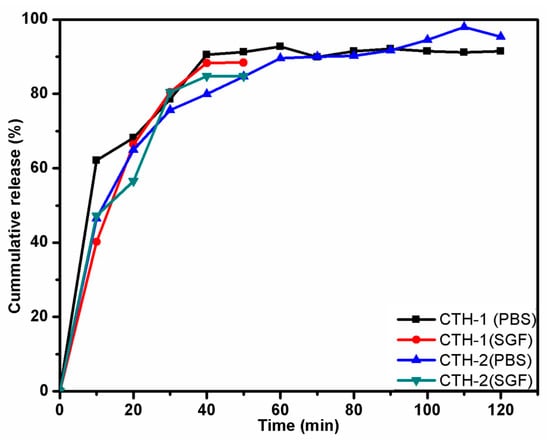 Ciprofloxacin hydrochloride monohydrate, a model drug, was loaded in two films coded as CTH-1 and CTH-2 (Table 7). Based on encouraging results as described in Section 3.1, Section 3.2, Section 3.3, Section 3.4 and Section 3.5, the CTH-1 and CTH-2 blend films were selected. These two blend films had a greater concentration of natural polymer used in the present study (chitosan). However, CTH-3 and CTH-5 showed more solubility in aqueous media and CTH-4 film had a greater concentration of PAH. The controlled drug release from both films (CTH-1 and CTH-2) was studied in SGF (pH 1.2) as well as in PBS (pH 7.4) solution as a function of time at 37 °C (Figure 9). In the case of SGF, it was observed that most of the drug, around 88% from CTH-1 and 85% from CTH-2, was released in 50 min. On the contrary, in the PBS solution, the CDR for CTH-1 and CTH-2 was around 93% in 90 min and 98% in 120 min, respectively. The balance amount of drug could not be determined because both films converted into gel-like material due to acidic dissolution in SGF and fragmented in PBS after 30 min (CTH-1) and 120 min (CTH-1). The drug release in PBS solution at 120 min for CTH-1 sample was significantly higher in the CTH-2 sample (mean = 95.30%, SD = 1.40) than the CTH-1 sample (mean = 91.44%, SD = 1.87), t (4) = −2.86, p-value < 0.05. A similar pattern was observed for the SGF solution; mean for the CTH-1 sample was 88.39% (SD = 0.51), while the mean was 84.78% (SD = 0.48) for the CTH-2 sample; t (4) = 8.87, p-value < 0.005. From these results, it could be deduced that the drug was released in a controlled manner in the PBS solution, when compared to the SGF.