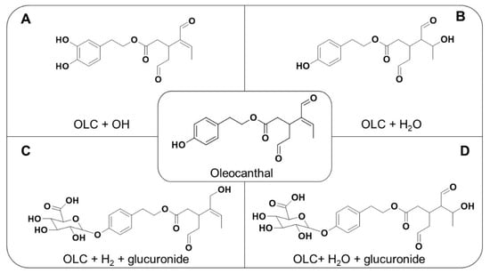 Chemical structure of oleocanthal and metabolites (A) = hydroxylated OLC; (B) = hydrated OLC; (C) = hydrogenated glucuronide; (D) = hydrated glucuronide).