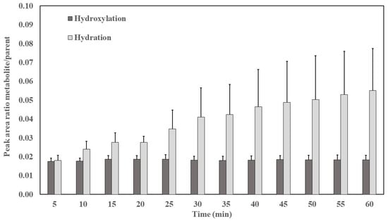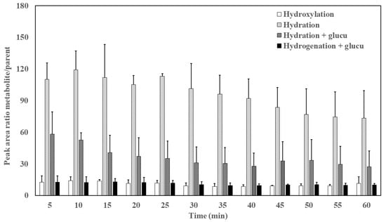 The appearance in plasma of metabolites arising from phase II reactions (glucuronidation of hydrogenated and hydrated metabolites) from time 0 (at the start of the in situ intestinal perfusion) to 60 min are depicted in Figure 3. The main phase II metabolite detected in plasma samples was the hydrated metabolite with constant relative abundance over time (p < 0.05).