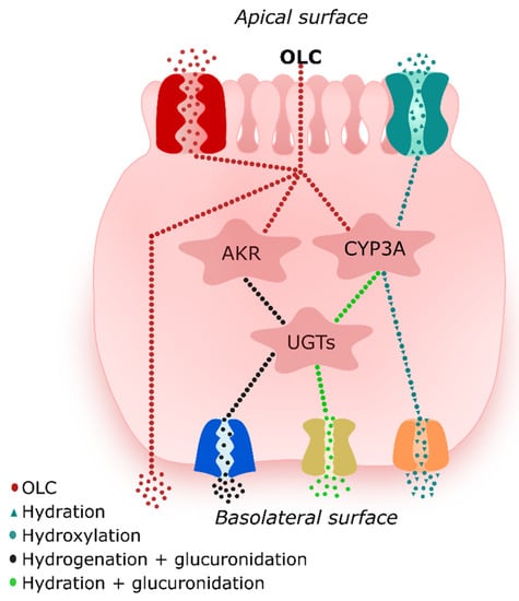 As shown in Figure 2 and Figure 3, the most abundant phase I metabolite found in the samples was the hydrated form, with higher levels in plasma than in the lumen (p < 0.05). The metabolites in the lumen can originate from the microbiome, since many bacterial cytochromes P450 (CYP) are soluble [26], or from CYP of the enterocytes. This family of metabolic enzymes are present in the epithelium of the small intestine [27] and are responsible for the oxidative biotransformation of xenobiotics and other compounds [28]. The absorbed and metabolized OLC would be subsequently secreted to the intestinal lumen by efflux transporters.
