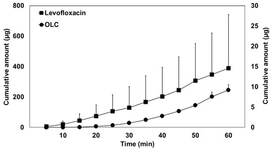 Transport of oleocanthal (OLC) (right Y-axis scale) and levofloxacin (left Y-axis scale) from the intestinal lumen to the mesenteric blood. Cumulative amount values are normalised to a 10-cm intestinal segment. Results are expressed as the mean ± standard deviation.