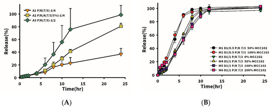 Firstly, the drug mixed with excipient (P/K = 7/3) at different proportions (drug/excipient ratio, D/E) was formulated to observe the effect of the added amount of excipient on drug release. Drug release with 5% Aerosil 200 added at a fixed drug to P/K ratio of 1/4 was also compared. Results shown in Table 5 and Figure 2A reveal that a higher added amount of excipient led to a slower drug release rate. When the D/E ratio was equal to 1/4 (A1 formulation), drug release reached only 38% in 24 h, whereas it was 95% in 24 h for D/E ratio equivalent to 1/2 (formulation A3). However, the tablet hardness for the latter was much lower than that for the former, which was unfavorable for clinical application. Therefore, Aerosil 200 was added to formulation A1 to help provoke a wicking effect of water into the tablet to rapidly induce a widespread swelling effect in the tablet. It turned out that formulation A3 with 5% Aerosil 200 in formulation A1 at the same D/E ratio of 1/4 exhibited a three-fold increased drug release rate at 24 h. Nevertheless, in the pharmaceutical industry, the addition of Aerosil 200 to formulations is usually at 0.5–1%; thus, other suitable dissolution-enhancing agents must be found to increase the drug release rate and increase the hardness of the tablet.