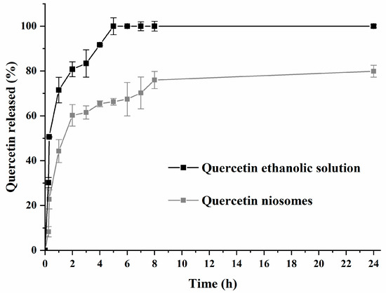 After the incorporation of quercetin in niosomes, a similar FT-IR spectrum of quercetin-loaded niosomes was obtained when compared to plain niosomes. The characteristic quercetin-related peaks were not identifiable, which could provide evidence for the possible quercetin–niosomes interaction, highlighting drug retention inside niosomes and its sustained release [51] (Figure 4).
