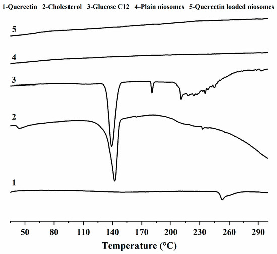 DSC thermograms of quercetin, cholesterol, glucose C12, plain niosomes and quercetin-loaded niosomes (F2) are shown in Figure 3. Quercetin showed a broad endothermic peak at 252.9 °C, with heat enthalpy of 17.7 J/g. This result was in accordance with those of previous studies [44].