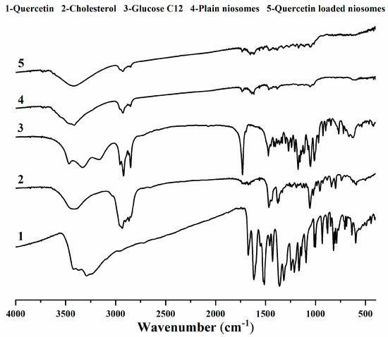 FTIR spectra of quercetin (1), cholesterol (2), glucose monolaurate (3), plain niosomes (4) and quercetin-loaded niosomes (5).