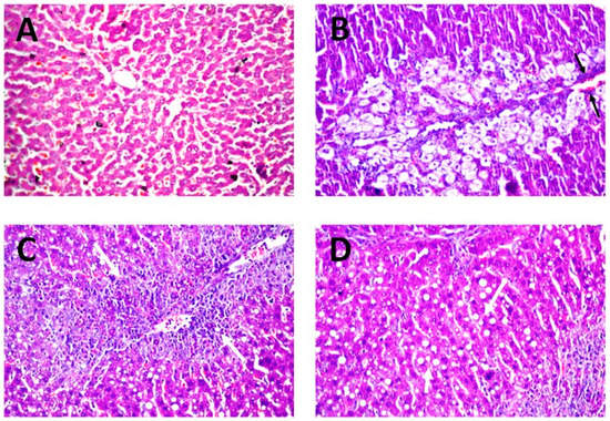 The serum markers of hepatic injury were further endorsed by the results of histopathological investigation. As revealed in Figure 8A, photomicrograph liver biopsies after administration of the normal saline (negative control) exhibited no histoarchitecture alteration. The normal structure of the central vein and surrounding hepatocytes in the parenchyma, with well-preserved cytoplasmic and nuclear appearance, were recorded. On the other hand, photomicrograph of rats intoxicates with CCl4 depicted remarkable centrilobular necrosis and ballooning degeneration in the hepatocytes surrounding the central vein in diffuse manner all over the hepatic parenchyma. Considerable congestion of blood vessels and fatty globules accumulations were also detected, as denoted by the black arrows in Figure 8B.