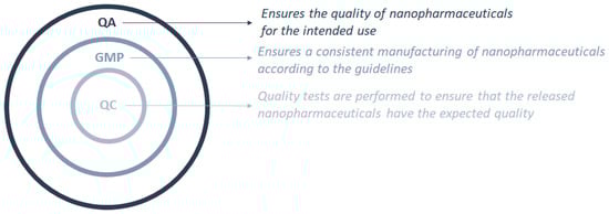 The exceptional, unique, and singular characteristics of nanopharmaceuticals are associated with their size, matrix composition, and surface properties [4,5,11,40,41,42,43]. As such, the current legislation must suffer a shift to attend the needs of these new types of pharmaceuticals as these are not approachable with the current regulation applied to health products. Further application of these medicines in clinical trials is dependent on the approval of the production methods and the quality assurance of the final product by the implementation and verification of the GMP [39]. GMP are in fact a part of the quality assurance (QA) process that should be implemented to ensure that the nanopharmaceuticals are consistently manufactured following the specifications and with the required quality. Quality control (QC) ensures that the necessary quality check tests are carried out so that the nanopharmaceutical product to be launched has the expected quality for the intended use (Figure 1).