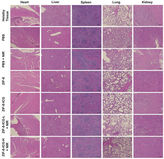 Hematoxylin and eosin-stained images of major organ sections after treatments with PBS, PBS+NIR, ZIF-8, ZIF-8-ICG, ZIF-8-ICG-L+NIR, and ZIF-8-ICG-H+NIR (Scale bar: 50 µm).