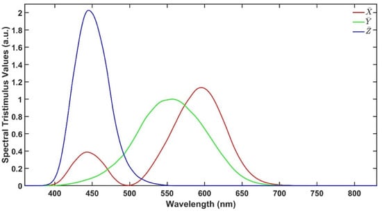 As described earlier, CIELAB colour space is an approach to express colour using three parameters: ‘lightness’ (L*), ‘green to red’ (a*) and ‘blue to yellow’ (b*) defined by the International Commission on Illumination (CIE). These parameters are calculated from the UV-Vis transmittance spectra in the range from 380 to 780 nm. Figure 2 illustrates the spectral tristimulus values , and that are used to calculate X, Y and Z using Equations (1)–(4), where T is the transmittance spectrum, S is the relative spectral power and λ is the wavelength. Then, L*, a* and b* are calculated using Equations (5)–(7), where Xn, Yn and Zn are the spectral tristimulus values of the nominally white object. The values of , , , S and further explanation are available in [].