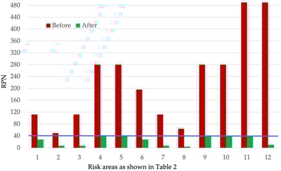 Risk priority number (RPN) values of the risk areas before and after control strategy implementation as described in Table 2 for the method.