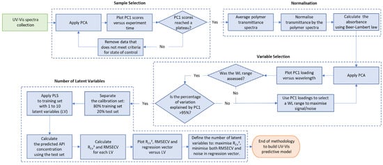 The procedure to build predictive models to read out real-time API concentration during HME process using in-line UV-Vis spectra is summarised in Figure 4. The methodology consists of four main data processing steps, which are sample selection, normalisation, variable selection and number of latent variables. Details of each step are presented in the sub-sections below.