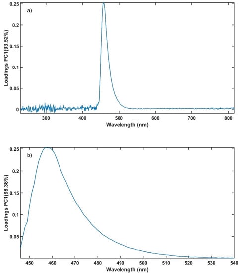 Figure 10a present the loadings of PC1 using the entire spectrum for the PCA. It is noticed that the loadings are close to 0 below 446 nm and above 540 nm. Using only the wavelength range from 446 nm to 540 nm for the PCA, the percentage of variation explained by PC1 is improved to 98.38% compared to 93.52% when using the entire spectrum (Figure 10b). The use of selected variables assisted the conformance of the method with the ATP.