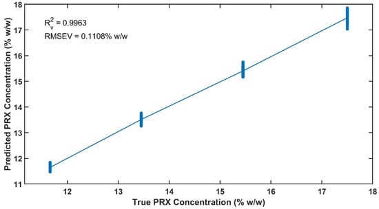 The trueness and precision of the UV-Vis are similar to the NIR method presented in [], furthermore Raman results for these two criteria are slightly worse than the values presented here [,,]. The Rv and RMSEV obtained in this study were better than the results reported using NIR and Raman spectroscopy [,,,].