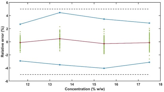 The accuracy profile is a visual tool to illustrate the analytical procedure performance. This approach applies total error to evaluate the risk of measurement failure. The β-expectation tolerance limits are calculated for each concentration level and 95% of the measurements should fall within the acceptance limits []. The acceptance limit, λ (Equation (9)), is the difference between the predicted API concentration by the model and the true value , and was set to 5% for API determination [,,].