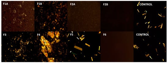 Polarized light microphotographs of formulations. Images were captured using Amscope polarized light microscope at 180× magnification. F1A, ibuprofen suspended cream (3% w/w) with Tefose 63, F1B, ibuprofen suspended cream (3% w/w) without Tefose 63, F2A, ibuprofen solubilized cream (3% w/w) with HPMC, F2A, ibuprofen solubilized cream (3% w/w) without HPMC, F3, ibuprofen suspended cream (5% w/w), F4 ibuprofen suspended cream (5% w/w), F5, ibuprofen emulgel (3% w/w), F6, ibuprofen clear non aqueous gel (3% w/w).