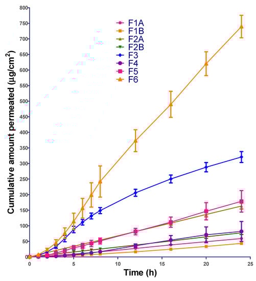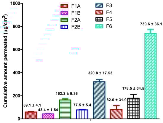 Cumulative amount of drug permeated from the formulations at the end of 24 h.