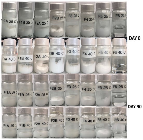 All the formulations were stored at 25 ± 2 °C and 40 ± 2 °C to observe any changes in the physical stability. As shown in the Figure 5, there were no observable changes in color and stability (phase separation, creaming, crystallization, and phase inversion) of all creams and gels. This suggests that all the formulations were physically stable throughout the storage period at both temperatures.