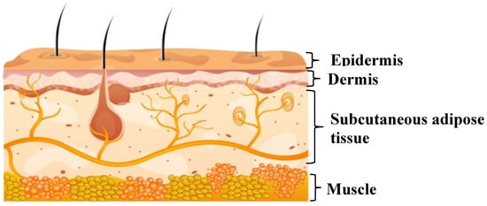 Beneath the stratum corneum, viable layers like the stratum granulosum, stratum spinosum, and stratum basal are present. The stratum basal is the layer which is actively proliferating via mitosis. The cell division in the basal layer eventually moves outwards towards the stratum corneum. During this period, the cells undergo morphological and histochemical changes (keratinization) to form the stratum corneum. Therefore, the loss of cells from the stratum corneum is compensated. The dermis is the skin layer with extensive blood circulation [27]. The capillaries in the dermal layer provide the sink condition for the molecules permeating through the transdermal route. Further, blood circulation is the key to maintaining skin temperature, for the supply of oxygen and nutrients, and to remove the toxins out from the skin. Below the epidermis, there are layers of hypodermis comprising the subcutaneous fat tissue (Figure 2). The hypodermis possesses the blood vessels, nerves, and regulates the temperature. This layer provides mechanical support to the epidermal and dermal layers.