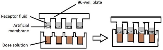 In PAMPAs, an artificial liquid membrane separates the donor and receptor compartments in 96-well plates. The receptor compartment consists of a buffer solution, and the donor compartment contains the drug for which permeability is to be determined. A typical PAMPA assembly is shown in Figure 3. The PAMPA was initially designed to estimate passive gastrointestinal absorption and blood-brain barrier permeability. A skin-PAMPA model was developed by adding synthetic certramides, cholesterol, and stearic acid [88]. In comparison to the diffusion cells, the PAMPA is preferred owing to its short time period required for the high-throughput screening of compounds for obtaining a permeation profile. Ottaviani et al., used isopropyl myristate (IPM), silicone oil, and corresponding mixtures as the liquid barrier in the PAMPA experiment to study the permeation profile of 19 compounds with different physiochemical properties. The permeability coefficient obtained from the PAMPA using liquid silicone membranes for eight different compounds was compared with the results obtained by Geinoz et al. [89]. The PAMPA results showed good correlation with the permeability coefficient measured using diffusion cells with a silicone membrane. This indicates that the PAMPA could be a possible alternative to diffusion cells in permeation studies. The liquid silicone membrane allows sufficient permeation of hydrophobic compounds but a poor permeation to polar compounds. Liquid silicone in the PAMPA could be used for screening compounds with diverse permeation profiles. IPM showed poor correlation in permeation coefficient values in comparison to the skin. Therefore, it was concluded that IPM alone could not mimic the skin barrier property in the PAMPA model. Further the mixture of 30% IPM and 70% silicone showed the best liquid artificial membrane mimicking the skin in the PAMPA model. This composition could discriminate the permeability coefficient as human skin permeability, and the correlation between these two parameters was good. The use of IPM in the mixture mimicked the nature of the stratum corneum to accept rather than donate the H-bond [90]. Sinko et al., aimed to develop a PAMPA model with the components of natural skin. The cholesterol, free fatty acids, and the ceramides analogues (namely synthetic certramides, long-chain tartaric acid diamides) were used in the preparation of the artificial membrane. The ceramides are expensive natural extracts, so the analogues of ceramides were synthesized and tested for the permeation. Among different ceramide analogues, ceramides analogue C8–C18 showed good correlation between the permeability of the compounds compared to human skin permeability. This study reported a strong correlation of the PAMPA (containing free fatty acids, cholesterol, and certramides in ratios close to 1) permeability data for 22 compounds with the results obtained from the human skin. Nevertheless, the most abundant ceramides in the human skin are of chain length C24–C26. The skin-PAMPA membrane was shown to be sensitive to the use of penetration enhancers like PEG 400 that is used in the formulation [91]. Luo et al., have demonstrated the superiority of the PAMPA over porcine skin and silicone membranes to discriminate different types of TDD formulations, i.e., gel and solution. This study observed a significant difference in permeation profiles of ibuprofen in the PAMPA from a simple solution and commercial ibuprofen formulations (Ibugel™ and Ibuleve™). Further, this study unraveled an appropriate finite dose in the PAMPA mode, which is 1 µL for ibuprofen. However, the finite dose for other active pharmaceutical ingredients might vary. The permeation profiles from the silicone membrane and the PAMPA were similar, whereas permeation from the human skin was found much lower compared to the PAMPA [92].