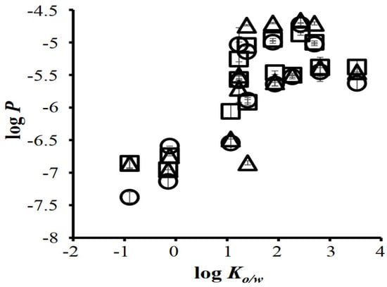 Relationships between the log Ko/w and log P of applied chemical compounds. Symbols: excised human skin (△), excised hairless rat skin (○), and Strat-M™ (□). All results are expressed as the mean ± S.E. (n = 3). P: permeability coefficient. Reproduced with permission from Uchida et al. [103].