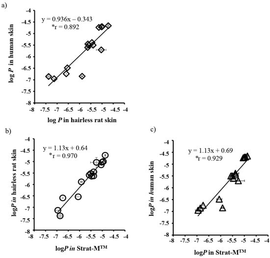 Relationships between log P values of human skin and rat skin or Strat-M™. (a) Human skin vs. Rat skin, (b) Rat skin vs. Strat-M™, (c) Human skin vs. Strat-M™. All results are expressed as the mean ± S.E. (n = 3). Pearson’s correlation coefficient showed significance (p < 0.05). Reproduced with permission from Uchida et al. [103].