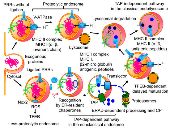 Maturation of endosomes and cross-presentation (CP). After internalization, exogenous proteins are transported into the endosome. Endocytic compartments without danger signals are acidified, fused with the lysosome, and designated as the proteolytic endosome. Since extracellular proteins without danger signals are self-proteins, those proteins are quickly degraded by the lysosomal proteases, which results in lower CP efficiency. When danger signals are detected by pattern recognition receptors (PRRs) (TLR2, TLR4, Nod1, Nod2), the acidification of endocytic compartments is delayed by the incomplete assembly of V-ATPase and the activation of Nox2, and resulted in the less-proteolytic endosome. The activated Nox2 produces reactive oxygen species (ROS), and ROS promote nonspecific disulfide bond formation to unfold extracellular proteins. As extracellular proteins with danger signals are non-self-proteins, these proteins are recognized by the endoplasmic reticulum (ER)-resident molecular chaperones in the non-classical endosome. Recognition by the ER-resident molecular chaperones accelerates ER-associated degradation (ERAD)-dependent processing of exogenous proteins and results in higher CP efficiency. ROS also activate TFEB, and activated TFEB promotes the maturation of the less-proteolytic endosome with a time difference. The activated TFEB also induces maturation of DCs by initiating the transcription of costimulatory molecules, several cytokines, and chemokines, including IL-1β, IL-6, TNF-α, and CCL5. In contrast to the major histocompatibility complex (MHC) I, MHC II presents antigenic peptides processed by lysosomal protease. MHC II associates with antigenic peptides under acidic conditions in the lysosome.