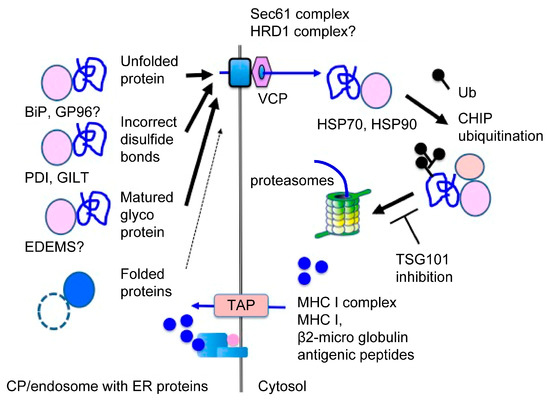 Only a small number of molecules have been shown to play a role in CP, compared to the retro-transport machinery. VCP was specifically associated with exogenous proteins in moDCs and BMDCs [134], and its inhibition abrogated CP ability in these DC subsets [95,134,138,150], indicating that p97 provides the energy to pull lumenal proteins into the cytosol. Similarly, carboxyl terminus Hsp70/90 interacting protein (CHIP), an E3 ubiquitin ligase, associated with CP substrates and played an essential role in CP in moDCs [134]. Tumor susceptibility gene 101 (TSG101), which is a dominant-negative regulator of polyubiquitination [153], colocalized with CP substrates and negatively regulated CP efficiency in BMDCs [138]. Cytosolic molecular chaperones, such as Hsp70 and Hsp90, were associated with CP substrates after retro-transport and were required for effective CP [133,154,155]. Altogether, these results indicate that ERAD-related molecules also play an important role in CP, suggesting that other ERAD-related molecules are also shared in CP. However, excessive ER stress results in inflammation or an immunosuppressive phenotype, which promotes cancer escape from the immune system. Further investigation is necessary to apply ERAD-dependent processing to antigen-loading methods.