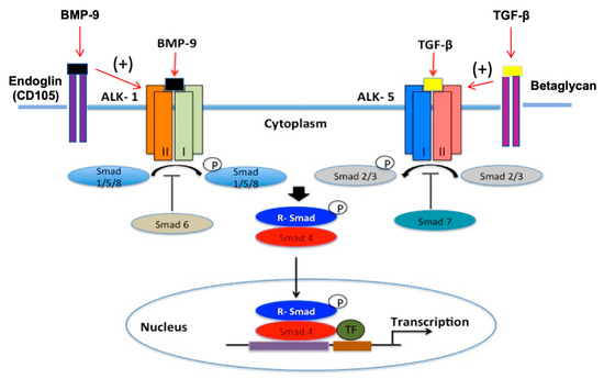 - Goumans, M.J.; Valdimarsdottir, G.; Itoh, S.; Lebrin, F.; Larsson, J.; Mummery, C.; Karlsson, S.; ten Dijke, P. Activin receptor-like kinase (ALK)1 is an antagonistic mediator of lateral TGFbeta/ALK5 signaling. Mol. Cell 2003, 12, 817–828. [Google Scholar] [CrossRef]