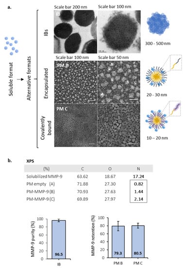 MMP-9 was successfully produced in L. lactis in its soluble form and as bacterial IBs, rendering nanoparticles in the range of 300 to 500 nm in diameter (Figure 1a). In a second step, soluble MMP-9 (97.4% purity) was loaded in polymeric micelles (PM), using two different approaches: encapsulated by electrostatic interactions (named PM B) and covalently bound (named PM C) (Figure 1a). PM B and PM C, as it occurs with IBs, were pseudo-spherical nanoparticles with sizes of 20–30 and 10–20 nm, respectively (Figure 1a). Besides, as shown by the slight increase in N presence in PM B and PM C in comparison to empty PM (XPS table, Figure 1b), a certain amount of protein (major source of N) was effectively bound to the PM surface for both protein loading strategies. Analyzing MMP-9 cargo in further detail, we observed the encapsulation efficiency of MMP-9 within the polymer was around 80%, being similar in covalent and ionic PM (Figure 1b). The percentage of MMP-9 forming IB nanoparticles achieved values of 96.5% (Figure 1b).