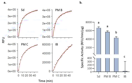 Initial MMP-9 activity (t = 0 h) in PBS incubations for the analyzed formats. (a) DQ-gelatin degradation kinetics for one of the replicates of 10 µg of solubilized MMP-9 (Sd), 10 µg of non-covalent MMP-9-PM (PM B), 10 µg of covalent MMP-9-PM (PM C), and 100 µg MMP-9 IBs (IB). Fluorescence reads along time (dots), and R model curves (red line) are represented. RFU = Relative fluorescence units. (b) Comparison of the specific activity (RFU corrected by time and MMP-9 µg) for the analyzed formats. Means and SEM are represented. Data were analyzed, using a fixed effect model with format as fixed effect. Different letters depict significant differences (p = 0.0003).
