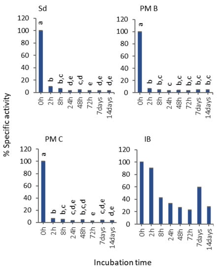 Although IBs showed the lowest activity values (Figure 2b), the specific activity evolution in 50% bovine serum at room temperature proved that they were the most stable format (Figure 3). The assessment of specific activity decrease revealed that soluble protein and polymeric nanoparticles lost almost all the activity after 2 h of incubation, while IBs kept a 28% of the activity after 14 d of incubation (Figure 3).