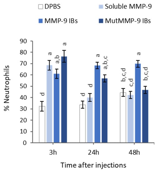 With the aim to determine if the results observed in vitro with MMP-9 IBs correlated with their performance in vivo, the soluble MMP-9, showing the highest biological activity (Figure 2), and MMP-9 IBs, showing the lowest activity but highest stability, were compared in mmp9 knock-out mice [22], following an air-pouch experimental model [23]. Mutant MMP-9 IBs, which are non-functional MMP-9 IBs formed by an enzymatically inactive mutant form of MMP-9, were also administered, to differentiate the specific MMP-9 effect from other components present in IBs but different from the recombinant MMP-9. After injections with DPBS (negative control), soluble MMP-9, MMP-9 IBs (active IBs), or mutMMP-9 IBs (inactive IBs), in mouse air-pouches, exudates were recovered and centrifuged at three different time points (3, 24, and 48 h), to analyze the number of neutrophils that migrated to the site of injection due to the action of MMP-9 at degrading the ECM. At 3 h post-injections, there were no significant differences in neutrophils percentage for any of the MMP-9 treatments (soluble MMP-9, MMP-9 IBs, and mutMMP-9 IBs) (Figure 4). However, cell recruitment at 24 h was higher in those animals injected with both MMP-9 IBs and mutMMP-9 IBs in comparison with the DPBS control and the soluble MMP-9 (Figure 4). While neutrophil count values of those animals treated with mutMMP-9 IBs returned to basal levels at 48 h, the total cell recruitment levels were kept high in those exudates of animals injected with active MMP-9 IBs (Figure 4).