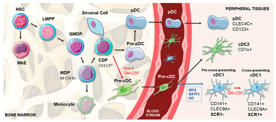 Schematic representation of cDC1 DC development. In the bone marrow, HSC gives rise to the LMPP, which settles at the apex of all myeloid and lymphoid lineages and is separated from the MkE. GMDP derives from the LMPP and produces the MDP (expressing M-CSFR), which further differentiates into the CDP, capable of generating the main DC subsets: pDCs, cDC1 and cDC2. pDCs terminally differentiate in the bone marrow, whereas pre-cDC migrate through the blood to lymphoid and non-lymphoid tissues, where they produce cDC1 and cDC2 subsets. Determining the differentiation pathway, Notch-dependent interactions of CDPs with stromal cells, in cooperation with GM-CSF, are crucial for the commitment to the cDC1 lineage, separating their pathway from pDCs. In peripheral tissues, the differentiation into CD141+ cDC1 is controlled by transcription factors, such as IRF8, Batf3 and Id2 (shown in blue). After engagement with the CD141+ pathway, the existence of a two-staged differentiation process of cDC1 populations is proposed, in which XCR1-negative cDC1s under the influence of GM-CSF (shown in red) acquire the expression of XCR1, representing the shift between a pre-cross-presentation phase and a subsequential cross-presenting stage. cDC, conventional dendritic cell; CDP, common DC precursor; DC, dendritic cell; GM-CSF, granulocyte-macrophage colony-stimulating factor; GMDP, granulocyte macrophage DC progenitor; HSC, hematopoietic stem cell; LMPP, lymphoid-primed multipotent progenitor; M-CSFR, macrophage colony-stimulating factor receptor; MDP, macrophage DC precursor; MkE, megakaryocyte and erythroid potential; pDC, plasmacytoid dendritic cell.