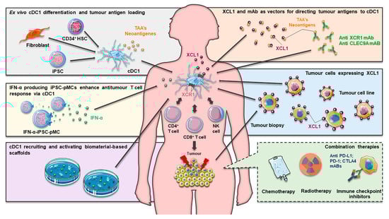 Despite the difficulties created by their extremely low-abundance, several approaches are being tested in order to exploit cDC1s in anti-tumor immunotherapies: ex vivo differentiation from CD34+ hematopoietic progenitors and from iPSCs, or the direct reprogramming of somatic cells, followed by antigen loading and administration; direct antigen targeting in endogenous cDC1; and strategies aiming to enhance their frequency and functions in tumors. Among these strategies, only cancer cells genetically engineered to express XCL1, and thus to attract cDC1, have been tested or are being currently evaluated in ongoing clinical trials [117,118]. It is expected that further approaches exploring the clinical use of these cells will strongly benefit from their combination with neoantigen targeting and the co-administration of immune checkpoint inhibitors [124,125]. Considering that blood DC populations were shown to ineffectively cross-present without adequate TLR stimulation, if these cells are used as a source, the rational selection of adjuvants or maturating agents during cell manipulation may arise as a key approach. Finally, the establishment of biomaterial-based scaffolds for the in situ recruitment and modulation of tissue resident DCs, namely cDC1 subsets, appears to be another strategy with plenty of potential for clinical translation (reviewed in [16]) (Figure 3).