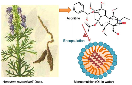 Aconitine is an active ingredient isolated from the herb Aconitum carmichaeli Debx., which is commonly used as an analgesic in traditional Chinese medicine, and transdermal administration can improve its safety [1]. Microemulsions, nanovehicles for transdermal drug delivery, involve isotropic, transparent, and thermodynamically stable dispersion systems spontaneously formed by the interaction between water, oil, surfactant, and co-surfactant in appropriate proportions [2]. Microemulsions have low surface tension, and they easily moisturize the skin and disrupt the firm structure of the stratum corneum [3]. In addition, they increase drug solubility, which can enhance drug permeation into the skin [4]. Aconitine-loaded microemulsions (Figure 1) have been demonstrated to improve transdermal drug absorption via topical administration [5].