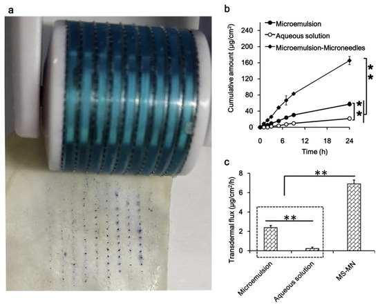 Microneedles and microneedle-treated rat skin (a), in vitro transdermal profiles (b), transdermal flux and skin deposition (c) of aconitine from microemulsion and the aqueous solution. ** p < 0.01, (n = 3).