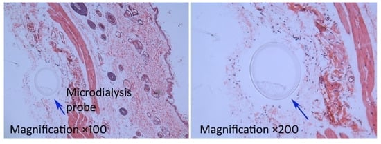 In order to accurately evaluate transdermal drug delivery using microneedles combined with nanotechnology, local microdialysis is a reliable tool. Microdialysis is a minimally invasive sampling technique that combines dialysis and continuous perfusion microsampling in vivo. The microdialysis probe is inserted into the tissue and perfused under non-equilibrium conditions, and the free, unbound analyte in the extracellular fluid diffuses through the membrane of the probe into the perfusate by the concentration gradient [12]. The advantage of microdialysis is that it can be used in vivo, in real time, and for online sampling without substantially interfering with normal life activities. Furthermore, it is particularly useful for studying dynamic changes in biochemical functions or determining the distribution of exogenous compounds in the body [13]. Microdialysis techniques have been widely used in the evaluation of dermal and transdermal drug delivery to enable the determination of drug distribution in the skin or subcutaneous tissue using in vivo sampling [14,15]. This technique has been used to successfully evaluate the transdermal absorption of various pharmaceutical ingredients loaded in nanosized carriers for topical administration [16,17].